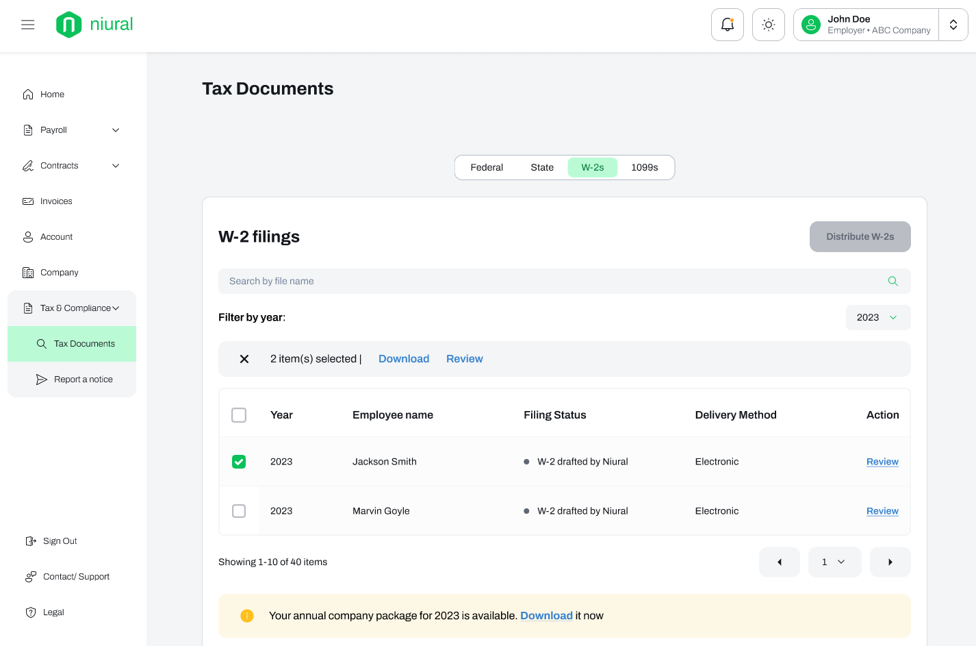 If an employee's benefit deductions or employer contributions are inaccurate on the W-2, please notify the Niural team. After our team makes the necessary corrections, a draft version of the W-2c (corrected W-2) will be accessible in the employee's profile. We'll send you and the employee an email notification once the draft form is ready for review.