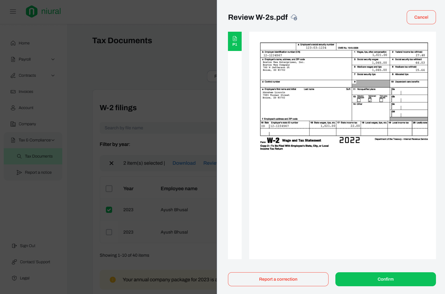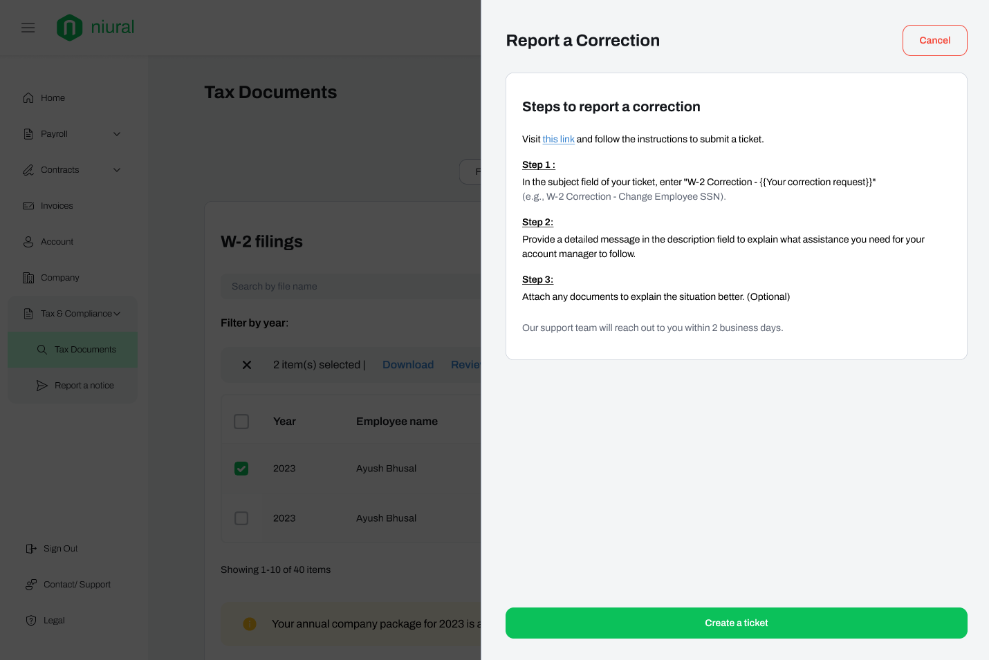 You'll gain access to the draft W-2 generated by Niural. To report any corrections, simply click the "Report a correction" button or follow the provided link for reporting corrections.