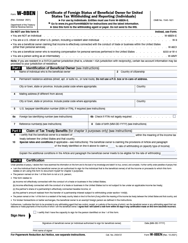 W-8BEN Form for Individuals