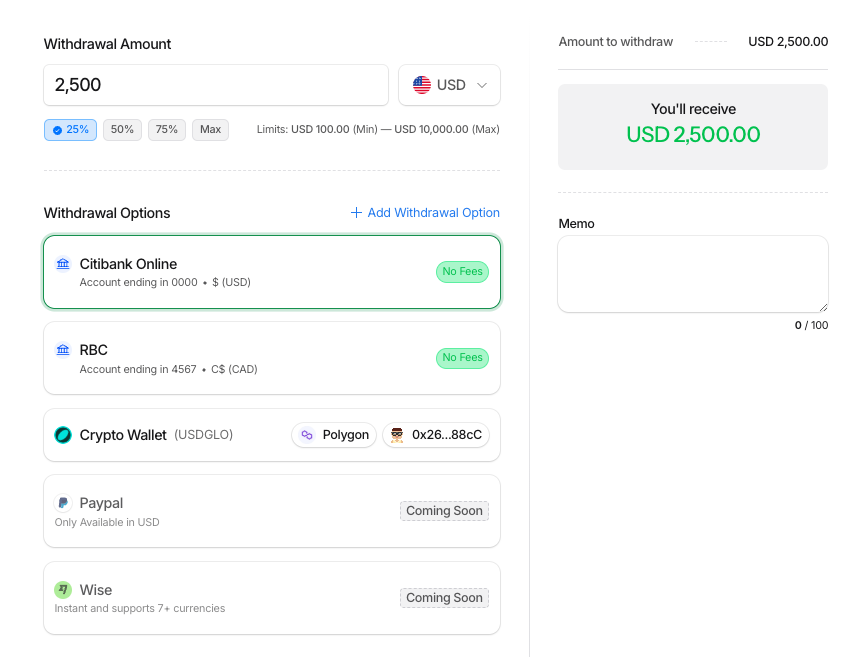 You can choose from the payout methods you have already added to your account (bank accounts, digital wallets, etc.).