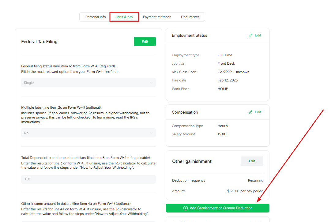Navigate to the Employee file > Jobs & Pay > Add Garnishment or Custom Deduction