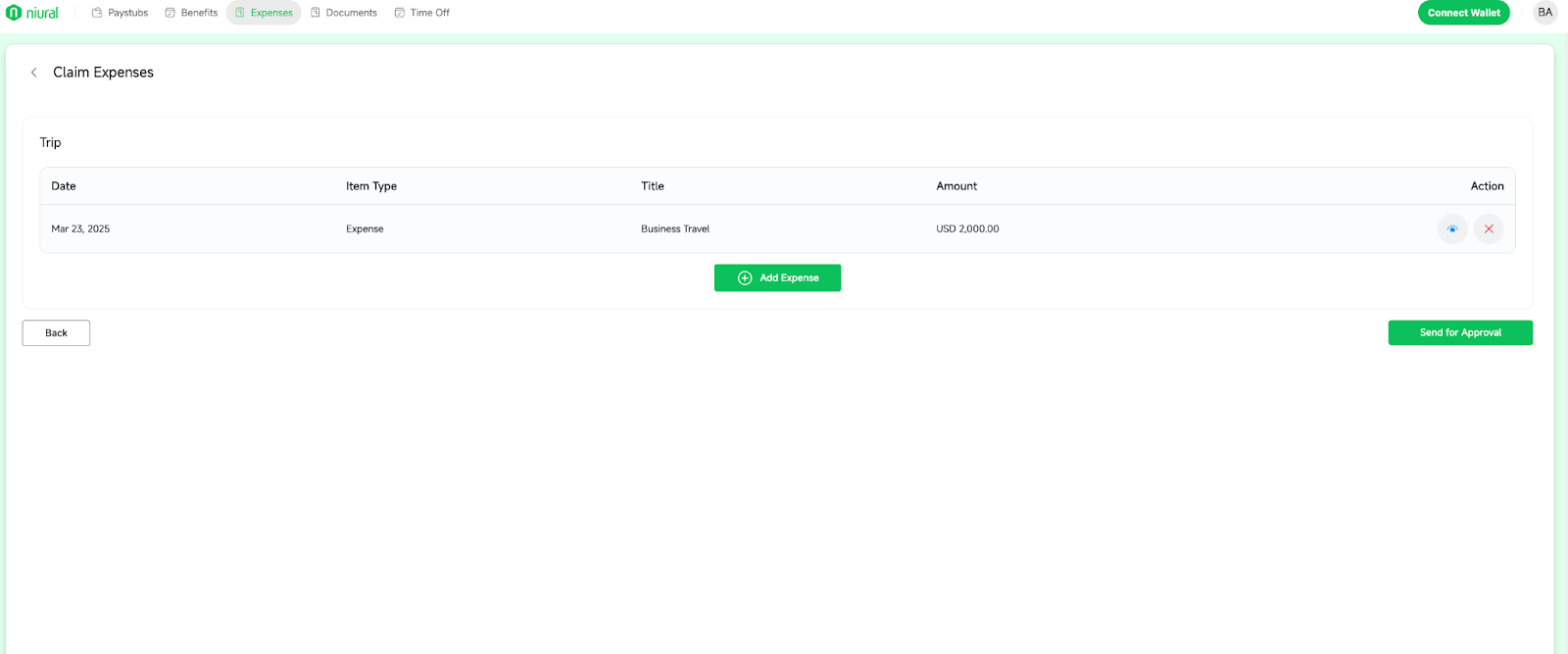 Once you've added all the expenses, click on "Send for Approval" to submit the report to your employer.